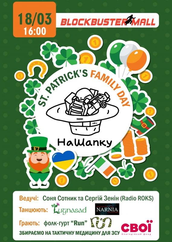 Святкуймо День св.Патріка у родинному колі під запальну ірландську музику і танці та робимо добру справу: аніматори, смачна їжа та круті атракціони від Парку розваг GALAXY у Blockbuster Mall.