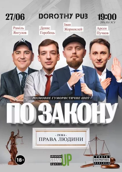 «ПО ЗАКОНУ» - розмовне гумористичне шоу в якому коміки фантазують над новими законами згідно обраної теми вечора. Тема: ПРАВА ЛЮДИНИ.
