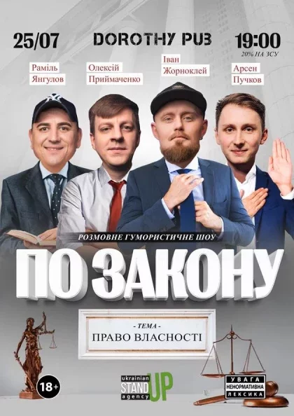 «ПО ЗАКОНУ» - розмовне гумористичне шоу в якому коміки фантазують над новими законами згідно обраної теми вечора. Тема: ПРАВО ВЛАСНОСТІ.