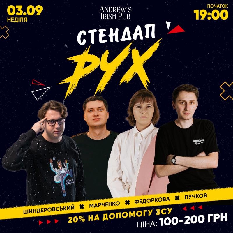 У неділю третього вересня максимально заряджені коміки внесуть посмішок у цей неспокійний час. Стендапери роздадуть актуальної комедії, зарядять на цілий тиждень життям, свободою думки та зневагою до "північно-східних боліт" на сцені Andrew's Irish Pub на Подолі.