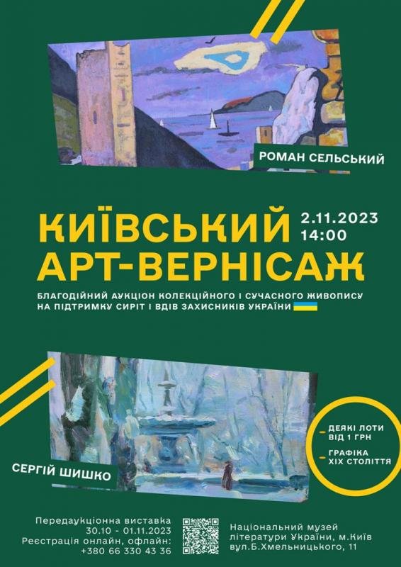 Запрошуємо підтримати сім’ї загиблих захисників України та взяти участь у благодійному аукціоні колекційного та сучасного живопису «Київський арт-вернісаж», який відбудеться 2 листопада 2023 року у Національному музеї літератури України (вул.Б.Хмельницького, 11, метро «Театральна»). На продаж буде виставлено 100 робіт. Основна добірка – це картини відомих українських художників: Федора Захарова, Зінаїди Зацепіної, Сергія Шишка, Валентини Цвєткової, Петра Столяренка, Тетяни Яблонської, Віктора Шаталіна, Льва Ходченка, Матвія Когана-Шаца, Петра Сабадиша, Якубека Карела, Степана Усика та багатьох інших, чиї ймена входять до скарбниці українського живопису.