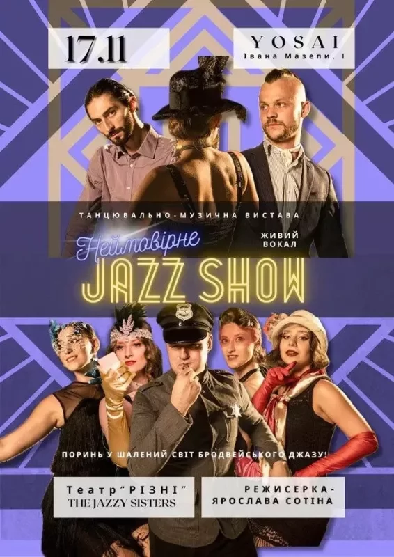 На вас чекає інтригуючий сюжет, запальні танці, живе виконання бродвейських хітів 30х-40х років XX століття Jazz бенду.