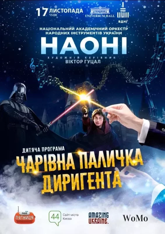 Уявіть собі зустріч Гаррі Поттера та Дарта Вейдера. Ви б, певно, хотіли побачити це на власні очі. Дитяча програма “Чарівна паличка диригента” дарує вам цю унікальну можливість. НАОНІ Оркестра та диригент разом, із популярними персонажами, проведуть вас у фантастичний світ. Ви побачите фрагменти з фільмів про Гаррі Поттера та з циклу “Зоряні війни”. І все це під неймовірну музику!