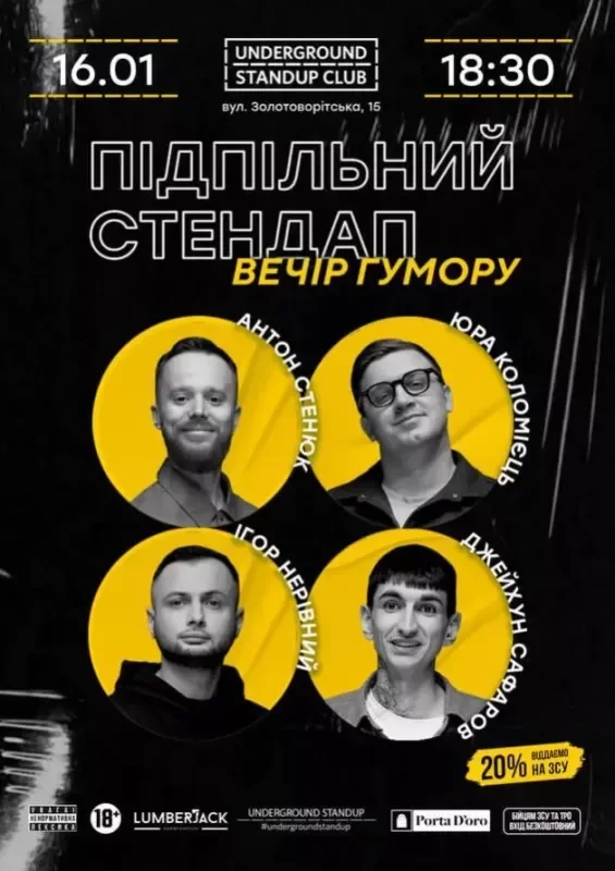 Вхід для бійців ЗСУ та ТРО - безкоштовний (за попереднім записом в інстаграм @undergroundstandupkyiv)