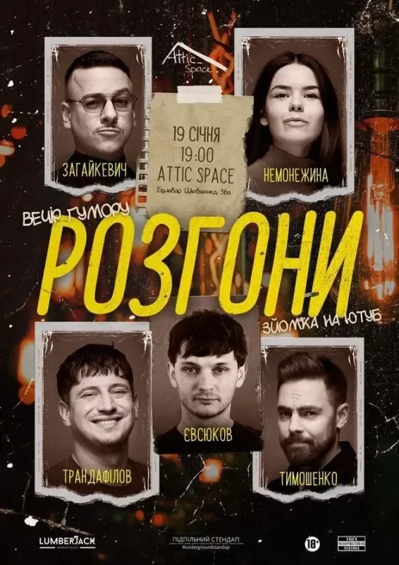 Пропонуємо вашій увазі формат стендап вечірок «Розгони», крім класичної стендап комедії, ви побачите імпровізаційний формат в якому коміки разом будуть сидіти на сцені, обговорювати хвилюючі та актуальні теми, і жартувати прямо тут і зараз.