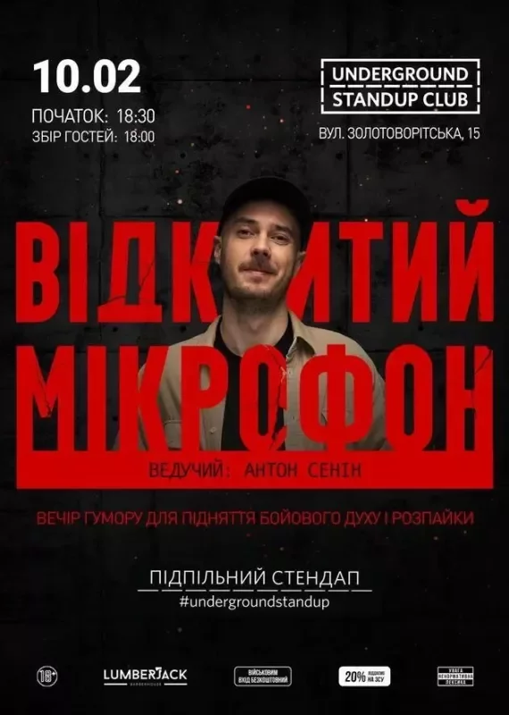 **вхід для бійців ЗСУ та ТРО - безплатний (за попереднім записом в інстаграм @undergroundstandupkyiv)