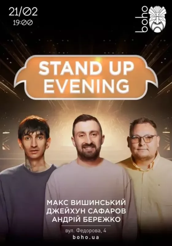 На сцені розкішного ресторану «Boho» виступатимуть справжні зірки українського стендапу. Добрий та інтелігентний Макс Вишинський, колоритний та щирий Джейхун Сафаров, різкий та непередбачуваний Андрій Бережко.