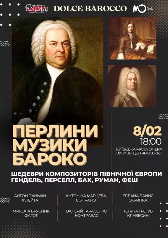 Ансамбль "Dolce Barocco" та Творче об'єднання "Anima" запрошують Вас на нову ексклюзивну програму барокової музики північної Європи. Виразне сопрано, тендітна скрипка, віртуозна флейта, оксамитовий фагот, та мрійливий клавесин з барвистим контрабасом виконають для вас твори композиторів Німеччини, Нідерландів, Бельгії та Англії 17-18 століть.