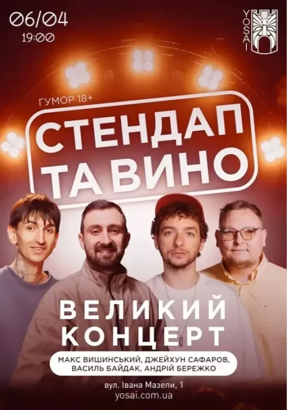 На сцені розкішного концерт-холу «Yosai» виступатимуть справжні зірки українського стендапу. Добрий та інтелігентний Макс Вишинський, абсурдний та дотепний Василь Байдак, різкий та непередбачуваний Андрій Бережко, колоритний та щирий Джейхун Сафаров.