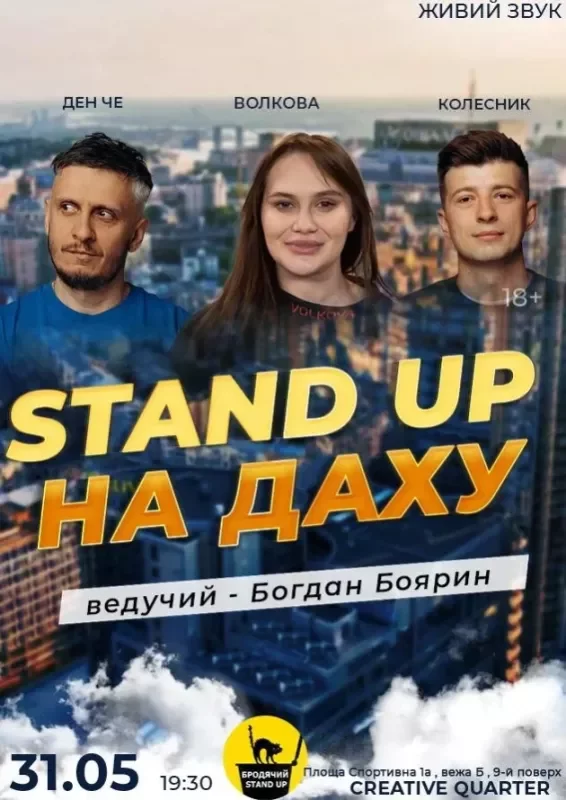 "Запрошуємо вас на комедійний вечір під відкритим небом - Stand Up на Даху! Ми запрошуємо вас провести незабутній вечір у веселій компанії на даху одного з найкращих місць у місті. Наші найкращі стендап-коміки приведуть вас до сміху своїми гумористичними історіями та жартами про життя. Насолоджуйтесь неймовірним видом на місто та пориньте у світ гумору та розваг!