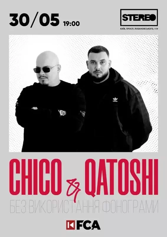 Chico & Qatoshi — це дует українських реп та хіп-хоп виконавців. Chico з Луганщини, а Qatoshi з Чернівців. Їхні пісні єднають українців. Вже зовсім скоро виконавці Chico & Qatoshi дають свій сольний концерт у вашом місті, де разом з вами заспівають улюблені хіти та нові пісні.