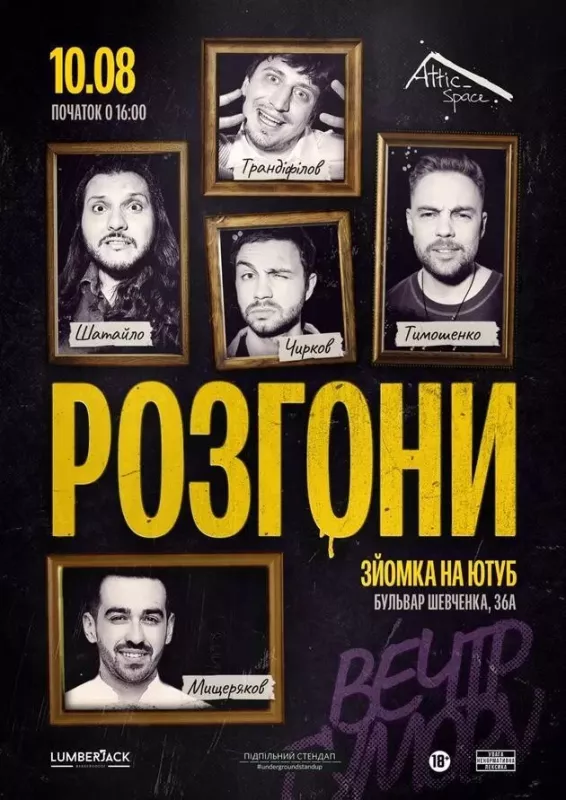 "Підпільні Розгони" - це залаштунки стендап комедії, коли коміки збираються і діляться своїми заготовками, спостереженнями і новими темами для стендапу, і у той самий момент разом накидують нові жарти і вектори для комедії, простіше кажучи вони «Розганяють» ці теми.