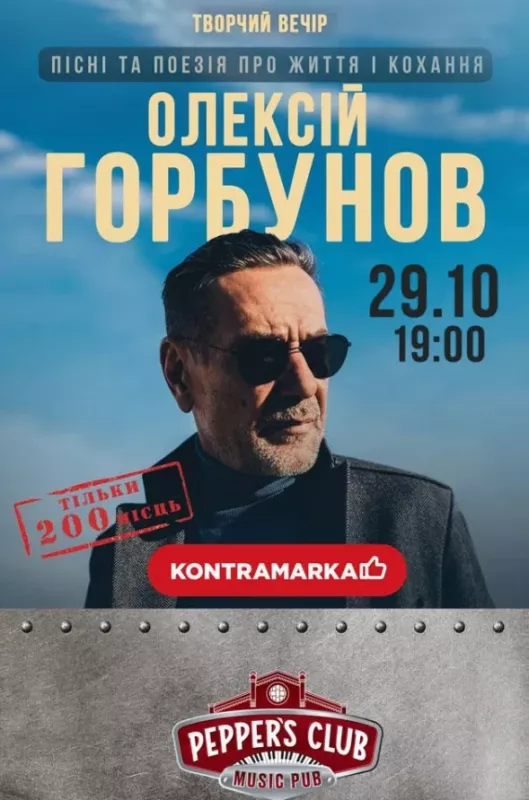 Талановитий актор, яскравий артист, харизматична особистість – артист Олексій Горбунов в супроводі live band дасть акустичний квартирник лише для 200 гостей.