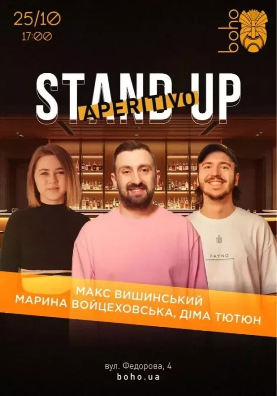 На сцені виступатимуть троє відомих коміків: Макс Вишинський, Діма Тютюн та Марина Войцеховська. Незабутній та стильний гумор артистів задасть тобі настрій на весь вікенд.