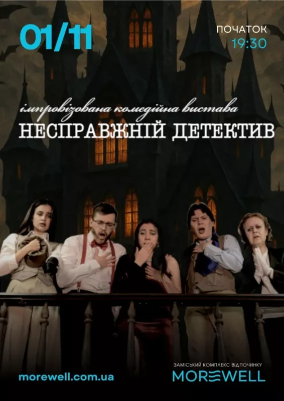 Термінові новини: власник англійського маєтку став жертвою жахливого злочину! Ким будуть підозрювані — вирішують глядачі! Так починається «Несправжній детектив»: повністю імпровізована театральна комедія, натхненна творами Агати Крісті. Медіум і співачка. Дворецький і розорений граф. А може, відставний гонщик у компанії ілюзіоніста-невдахи? Тут глядацька зала не просто спостерігає за подіями, а виступає у ролі співавтора неповторного детективного роману (назву якого також обирає вона). Можна ще довго описувати, як наші актори не забувають текст (бо його не написано заздалегідь). Як гумор (це ж передусім комедія!) народжується «тут і зараз». Але краще підсумувати цитатою театральних критиків, якби вони знали про наше існування: «Хай би мене лисий біс ухопив, якщо це не сон!» І якщо це вас ще не переконало купити квиток, то ось фіналочка: хтось із наших акторів грав в «Учениці Мольфара».