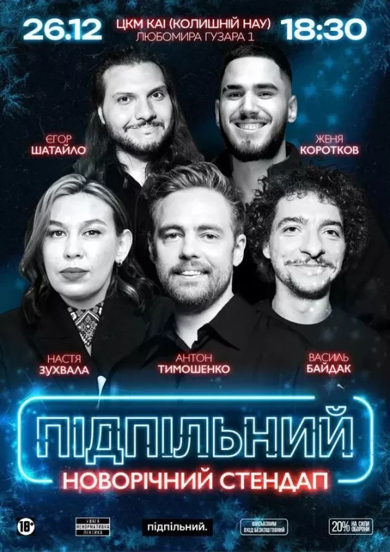 Запрошуємо вас на Новорічний Підпільний Стендап з топовими жартами та коміками для всіх тих, хто відкладав похід на стендап цілий рік і, звісно ж, для тих, хто вже давно входить до числа найелітарніших глядачів Підпільного Стендапу. Це чудова можливість зібратись з друзями, тимчасово забути про клопоти та насміятись на рік вперед або ж назад.