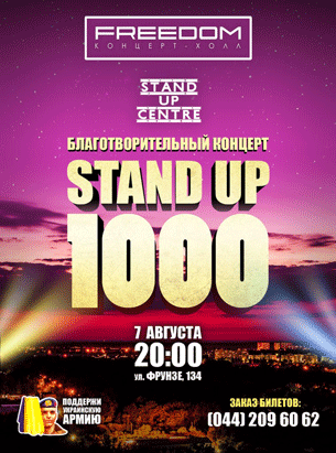 Благотворительный концерт Stand Up Centre. Главная и единственная цель организаторов концерта – собрать средства, что бы перечислить их на нужды военнослужащих, которые защищают Украину на Востоке страны. Цена билета на концерт Stand Up Centre составляет 50 – 150 гривен. Покупая билет, зритель поможет украинским военным, которые борются за мир и покой на территории нашего государства. Stand Up Centre совместно с концерт-холлом «Freedom» решили не оставаться в стороне от сложившийся ситуации в Украине и таким образом поддержать украинскую армию. В зале концерт-холла «Freedom» будут находиться ящики для благотворительных взносов, куда каждый сможет положить сумму денег, которую считает нужной.