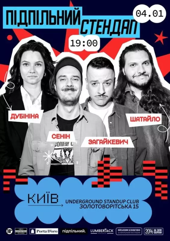 вхід для бійців ЗСУ та ТРО - безкоштовний (за попереднім записом в інстаграм @undergroundstandupkyiv)