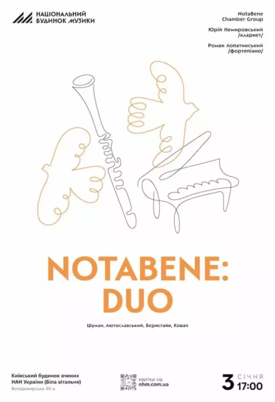 Програму виконає дует солістів NotaBene Chamber Group: Юрій Немировський (кларнет) та Роман Лопатинський (фортепіано), пропонуючи слухачеві зосереджений і водночас багатогранний погляд на можливості цього ансамблю інструментів.