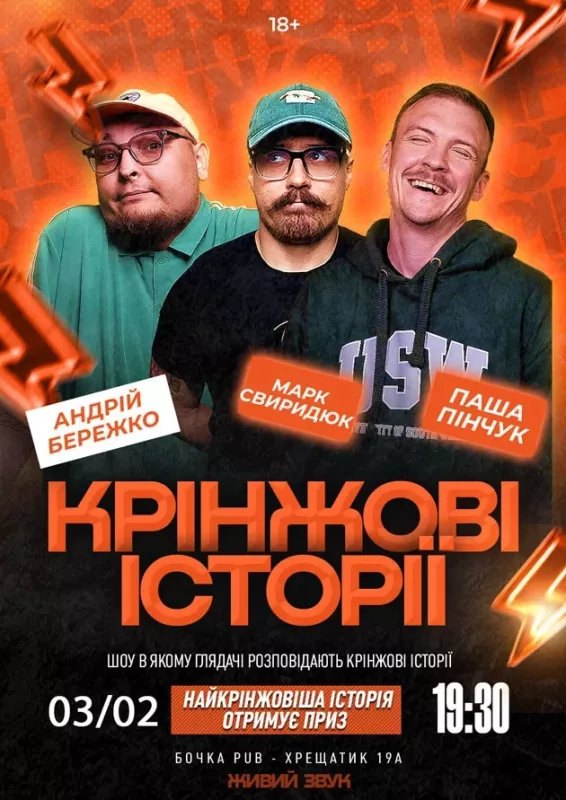 Привіт , запрошуємо вас на шоу «Крінжові історії» Шоу в якому глядачі розповідають крінжові історії, найкрінжовіша історія вечора отримує приз (Глядач може взяти участь в шоу) Це комедійний Івент з домашньою ламповою атмосферою який вам точно сподобається! Приходьте завчасно, так як буде відбуватись зйомка. Під час шоу замовлення не приймаються)