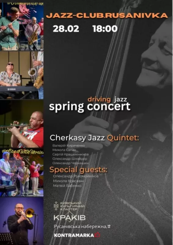 Цього вечора на великій сцені Кластера "Краків" відчайдушні музиканти гратимуть шалено драйвовий весняний джаз.Cherkasy Jazz Quintet — український музичний гурт, створений джазовим музикантом Сергієм Крашенінніковим у 2003 році в місті Черкаси. Виконує музику у стилі хард-боп.