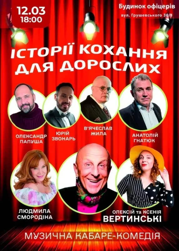 Запрошуємо вас на ефектну комедійну виставу «Історії кохання» (або діалоги про «це») за мотивами твору Збігнєва Ксьонджика у постановці В’ячеслава Жили. Найпікантніше та найпотаємніше зі сцени сміливо обговорюватимуть неперевершені актори, зірки театру та кіно Олексій Вертинський, Людмила Смородіна, Анатолій Гнатюк, Марина Андрощук, Олександр Папуша та В'ячеслав Жила.