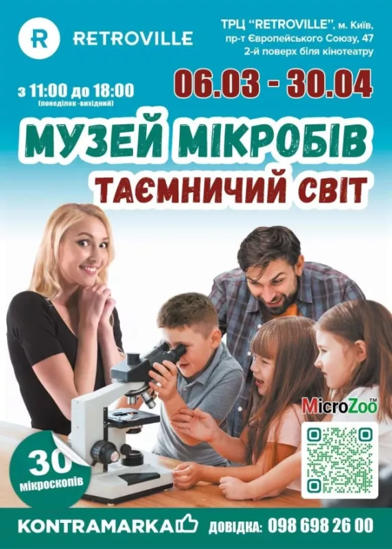 Через окуляри 30-ти мікроскопів дорослі та діти пізнають світ маленьких істот, від бактерій, планктону до комах. Багато з них не видимі для людського зору, але живуть поряд з нами. Виставка доповнює навчальну програму для школярів, зокрема по предмету біології.