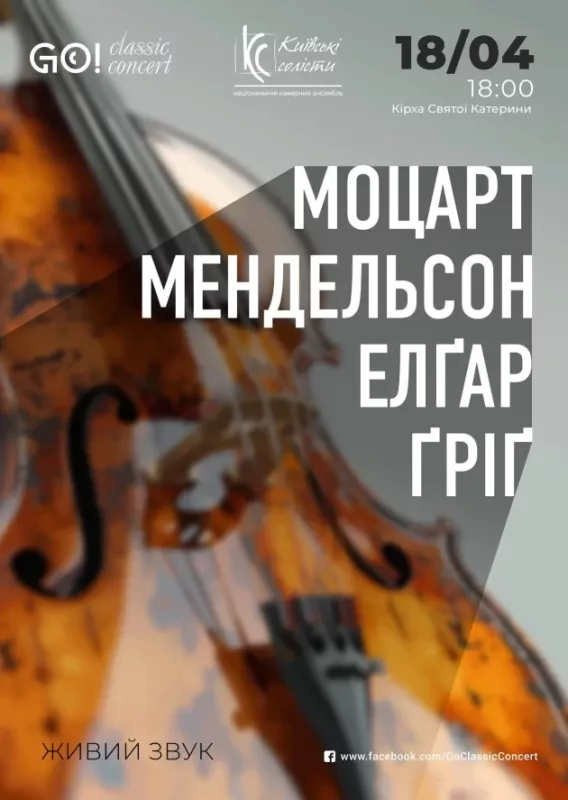 В атмосферному акустичному залі старовинної Кірхи Святої Катерини в самому серці Києва у виконанні Національного камерного ансамблю «Київські солісти» відбудеться вишуканий вечір, присвячений творчості чотирьох геніїв — Вольфганга Амадея Моцарта, Фелікса Мендельсона, Едварда Елґара та Едварда Ґріґа.