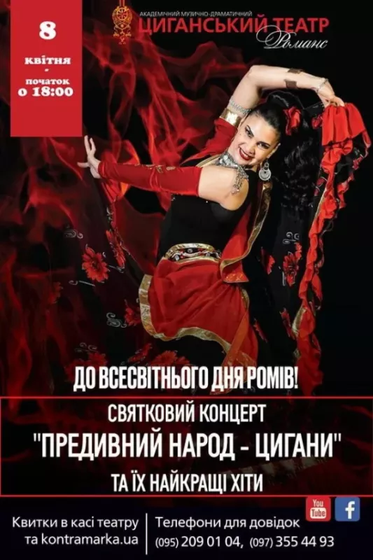 Відбудуться святкові концерти, присвячені Міжнародному дню циган. Циганський театр «Романс» традиційно презентує нову музичну програму своєму вірному глядачеві, з яким тісно пов’язані душа, серце і творчий шлях колективу.