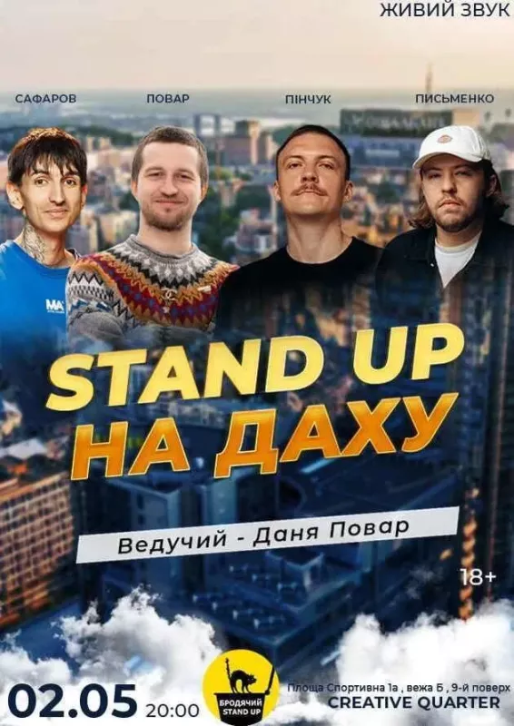 "Запрошуємо вас на комедійний вечір під відкритим небом ми запрошуємо вас провести незабутній вечір у веселій компанії на даху одного з найкращих місць у місті. Наші найкращі стендап-коміки приведуть вас до сміху своїми гумористичними історіями та жартами про життя. Насолоджуйтесь неймовірним видом на місто та пориньте у світ гумору та розваг!
