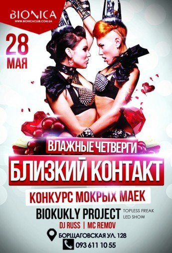 Шик, блеск, красота, эти три понятия сольются в один мощный поток удовольствия на вечеринке Влажный четверг "Близкий контакт" 28 мая в ночном клубе Бионика. Для Вас на сцене самый эпатажный проект страны Biokukly Project с ярким Topless Show. Похоть и желание сгустятся в воздухе и даже самые стойкие из мужчин не останутся равнодушными. Аккомпанемент, этого радующего взгляд действа, обеспечат DJ Russ и МС Женя Буш.