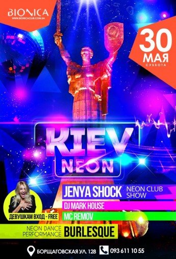 Представляем самое яркое party в столице, вечеринку "Neon Kiev". Окунись в мерцание ночного веселья с головой, стань свидетелем невероятного led-шоу. Поддайся своему шестому чувству и огни завораживающей илюмминации поднимут тебя на вершину наслаждения. Проведи незабываемую субботу и оторвись на полную, ведь завтра, выходной! Помогут создать незабываемую атмосферу Jenya Shock, Dj Mark House, Burlesque Led Show и Mc Женя Буш.