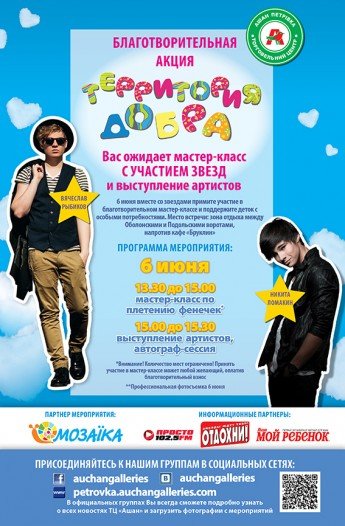 Мероприятие объединит неравнодушных посетителей ТЦ Ашан Петровка, а также талантливых украинских исполнителей – Никиту Ломакина и Вячеслава Рыбикова, и очаровательного ведущего Хит FM - Дениса Жупника, которые согласились поддержать своими выступлениями школу для детей с особыми потребностями «Мозаика». Еще Никита и Вячеслав приглашают всех принять участие в благотворительном мастер- классе и вместе со звездными гостями сделать себе подарок на память, предварительно оплатив благотворительный взнос, который пойдет на образование детей с особенными потребностями. Поделиться душевным теплом и помочь деткам в этот день смогут и посетители галерей бутиков ТЦ Ашан Беличи. В этот день здесь будет проходить мастер-класс, на котором любой желающий научится делать стильные украшения. А сопровождать активности будет живая музыка от профессиональных музыкантов.