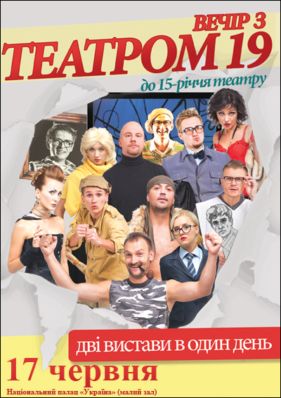 Час плине швидко - ось вже і «Театр 19» добігає свого 15-річчя! 17 червня 2015 року запрошуємо на «Вечір з Театром 19» на сцені Національного палацу мистецтв «Україна» (малий зал).