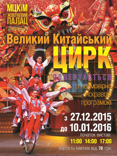 На цих новорічних канікулах Великий Китайський Цирк за участю 25 артистів на сцені виступить з 19 грудня 2015г по 10 січня 2016г. у таких містах, як Одеса, Харків і Київ.