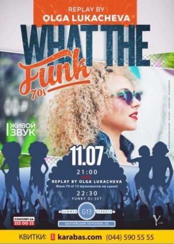 На летней площадке G13 Summer Terrace пройдет вечеринка What the Funk. Ольга Лукачева представит свой фанковый проект Replay. 12 лучших музыкантов Киева сыграют популярные фанк-композиции 70-х. Под открытым небом прозвучат известные хиты таких мировых звезд, как Roy Ayers, Lyn Collins, Jackson 5, а также современный фанки-муд от Janelle Monae и Pharrell Williams.