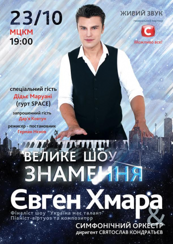 Состоится музыкальное шоу пианиста-виртуоза Евгения Хмары – Znamenie Это абсолютно новый подход к созданию современного инструментального концерта. Здесь режиссура тонкой нитью переплетается с музыкой, хореографией и невероятной световой сценографией. Из каждой композиции рождается история о любви, страдании и мечте. В шоу Znamenie соединяется классическое звучание симфонического оркестра и электронные басы dubstep.
