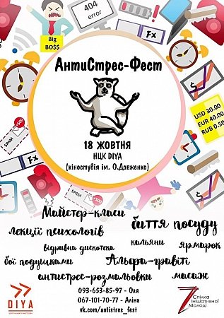 Избавиться от усталости, нервов и осенней депрессии, посетив фестиваль «Антистресс-фест» в киностудии им. Довженко. Вы будете бить посуду, драться подушками, сражаться в костюме сумоистов и раскрашивать картины. А еще в программе для вас приготовлены занятия по йоге, арт- и телесной терапии, качественное кино и лекции известных людей.