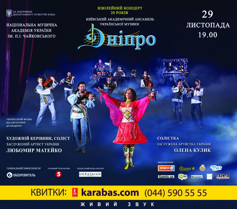 Киевский академический ансамбль украинской музыки «ДНІПРО» приглашает на юбилейный концерт, посвященный 20-летию творческой деятельности, состоится 29 ноября в большом зале Национальной музыкальной академии Украины им. П.И. Чайковского (консерватория), начало в 19.00.