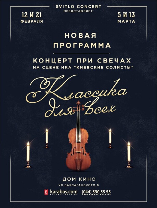 Приглашаем Васна необыкновенный концерт при свечах! Мы подготовили для Вас полностью новую программу, в которой прозвучат произведения выдающихся мировых композиторов Бетховена, Шуберта, Баха, Моцарта, Вивальди, Чайковского и многих других!