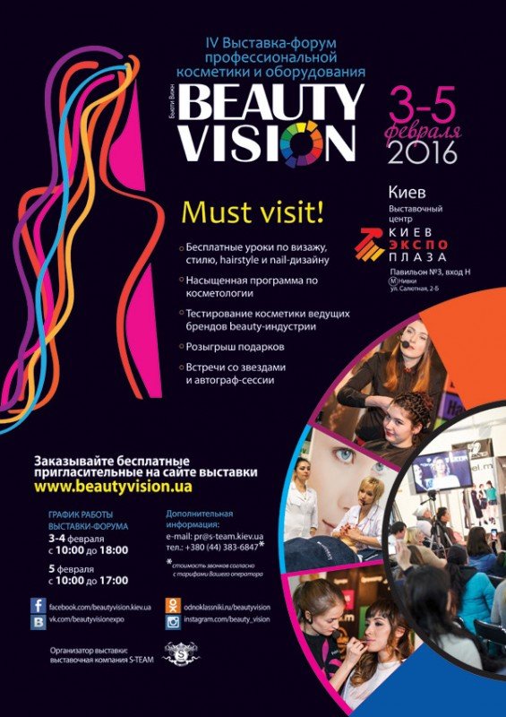 IV выставка-форум профессиональной косметики и оборудования BEAUTY VISION. Данное мероприятие собирает на одной площадке ведущих специалистов и компании, которые работают на рынке beauty-индустрии. Здесь каждый, кто желает развиваться или развивать свой бизнес в данной сфере, сможет найти для себя все необходимое и интересное .В рамках выставки состоятся уникальные мероприятия на открытых площадках для визажистов, стилистов, парикмахеров, мастеров ногтевого сервиса, косметологов, массажистов и представителей салонного бизнеса.