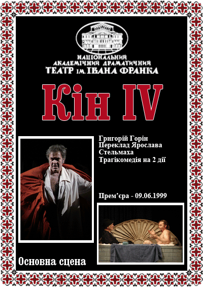 Григорій Горін Переклад Ярослава Стельмаха Кін IV Трагікомедія на 2 дії Художній керівник вистави – нар. арт. СРСР, лауреат Національної премії України імені Тарас Шевченка та Державної премії СРСР Сергій Данченко Режисер-постановник, музичне оформлення – нар. арт. України, лауреат Національної премії України імені Тарас Шевченка Анатолій Хостiкоєв Сценографія та костюми – засл. діяч мистецтв Ураїни Андрій Александрович-Дочевський Модельєр-конструктор – Тетяна Соловйова Балетмейстер – нар. арт. України Борис Каменькович Фехтування у постановці – нар. арт. України Володимир Абазопуло У виставі використано музику – вокально-інструментального ансамблю Beatles Звукорежисер – Олександр Пліса Художник по свiтлу – Ігор Ваховський Дiйовi особи та виконавцi: Едмунд Кін – нар. арт. України, лауреат Національної премії України імені Тарас Шевченка Анатолій Хостiкоєв Анна Дембі – засл. арт. України Тетяна Олексенко-Жирко, нар. арт. України, лауреат Національної премії України імені Тарас Шевченка Наталія Сумська Чарльз Кін – Анна-Марія Жирко Принц Уельський – нар. арт. України, лауреат Національної премії України імені Тарас Шевченка Олексій Богданович Граф Кефельд – засл. арт. України Олексій Паламаренко Єлена – засл. арт. України Любов Кубюк Ема Госуілл – нар. арт. України Iрина Дорошенко, нар. арт. України Поліна Лазова Лорд Мюіл – нар. арт. України Валерій Дудник Констебель – Володимир Зозуля, Анатолій Чумаченко, Вадим Полiкарпов Лікар – нар. арт. України Василь Мазур, нар. арт. України Євген Шах Хазяїн ресторану – засл. арт. України НазарЗаднiпровський Циліндр – засл. арт. України Анатолій Гнатюк, засл. арт. України Назар Заднiпровський Капелюшок – Лариса Красовська, Леся Липчук Кепка – Iван Кадубець, засл. арт. України Володимир Нiколаєнко Соломон – нар. арт. України Олексій Петухов У виставі беруть участь арт.и оркестру під керівництвом - засл. арт. України Володимира Гданського та арт.и балету театру Веде виставу засл. працівник культури України Віра Алименко Тривалість вистави – 3 год.
