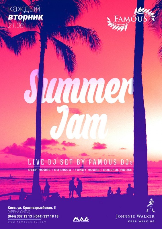 Любите ли вы лето так, как любим его мы? Продолжаем серию жарких вечеринок и приглашаем разделить атмосферу истинного драйва - террасу любимого клуба, каждый вторник, наполняет атмосфера настоящего релакса на тематическом вечере нового формата - Summer Jam. Гарантированно лучшие эмоции от начала и до конца вечеринки. Рекомендуем начать с лёгкого ужина от нашего шефа - трепетное отношение к каждому блюду не оставит вас равнодушными. Ритмичные биты лучших резидентов позволят сполна насладится вечером и вкусить всю прелесть настоящего отдыха. Ждём всех единомышленников окунутся в приятные, тёплые моменты наступивших летних вечеров. До встречи на самой танцевальной террасе столицы!