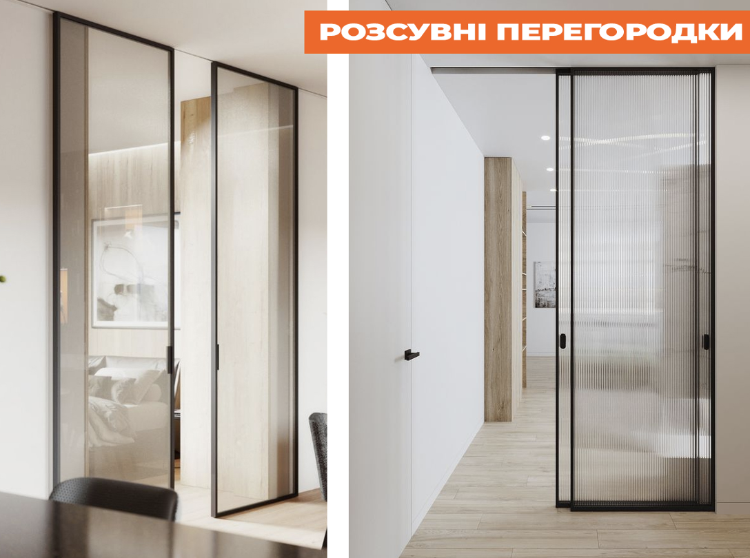 Скляні перегородки виготовляються на замовлення, що дозволяє врахувати особливості планування вашого простору, побажання до дизайну та типу відкривання (розсувні, розпашні тощо).