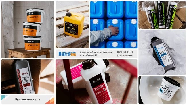 - Будівельна хімія: монтажні піни, герметики, мастики, праймери, пластифікатори, ґрунтовки, клеї.