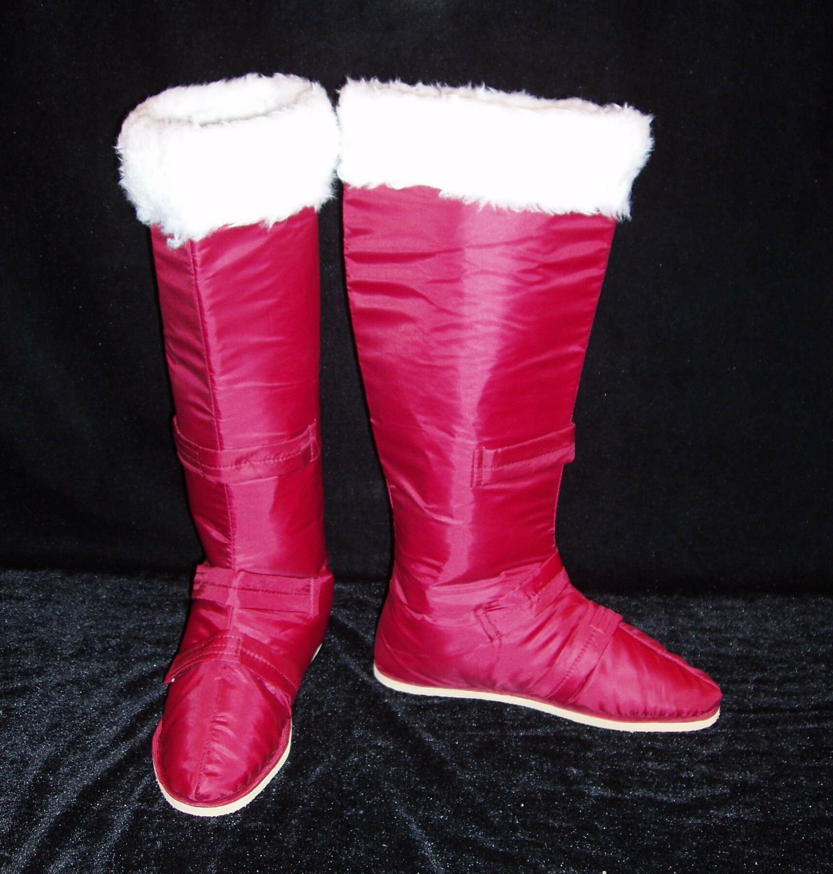 - Червоні чоботи — найпоширеніший варіант, особливо в образах, близьких до західного Санта Клауса. Вони символізують тепло, любов, щедрість та святковий настрій. У поєднанні з червоним плащем і білим оздобленням створюють яскравий, радісний образ, який особливо подобається дітям.