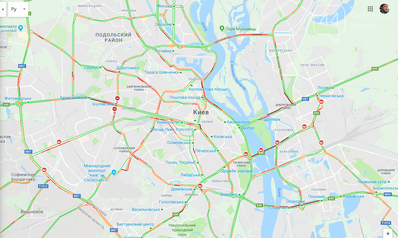 Так, по данным сервиса Google Maps, застыл в пробках проспект Победы: очень медленно двигается автотранспорт в сторону центра от станции метро "Святошин" до "Шулявки". Кроме того, тройное ДТП "сковало" движение на просп. Курбаса. Также есть заторы на улице Щусева от станции метро "Сырец" и до "Дорогожичей"