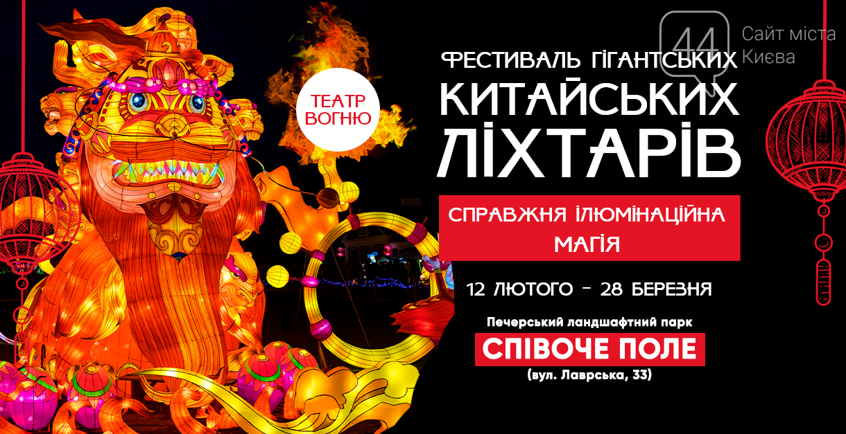 12 лютого на столичному Співочому полі стартує Фестиваль гігантських китайських ліхтарів. Відвідувачі побачать більше 30-ти ілюмінаційних локацій, що розкривають таємничий світ Піднебесної. Серед них - легендарна теракотова армія, велика китайська стіна, долина квітів, дерево бажань з чарівними пандами, сичуанська опера, персонажі стародавніх китайських казок та легенд. Спеціальним гостем програми стане гігантський Вогняний Лев, з яким можна буде зробити оригінальне фото на пам’ять.