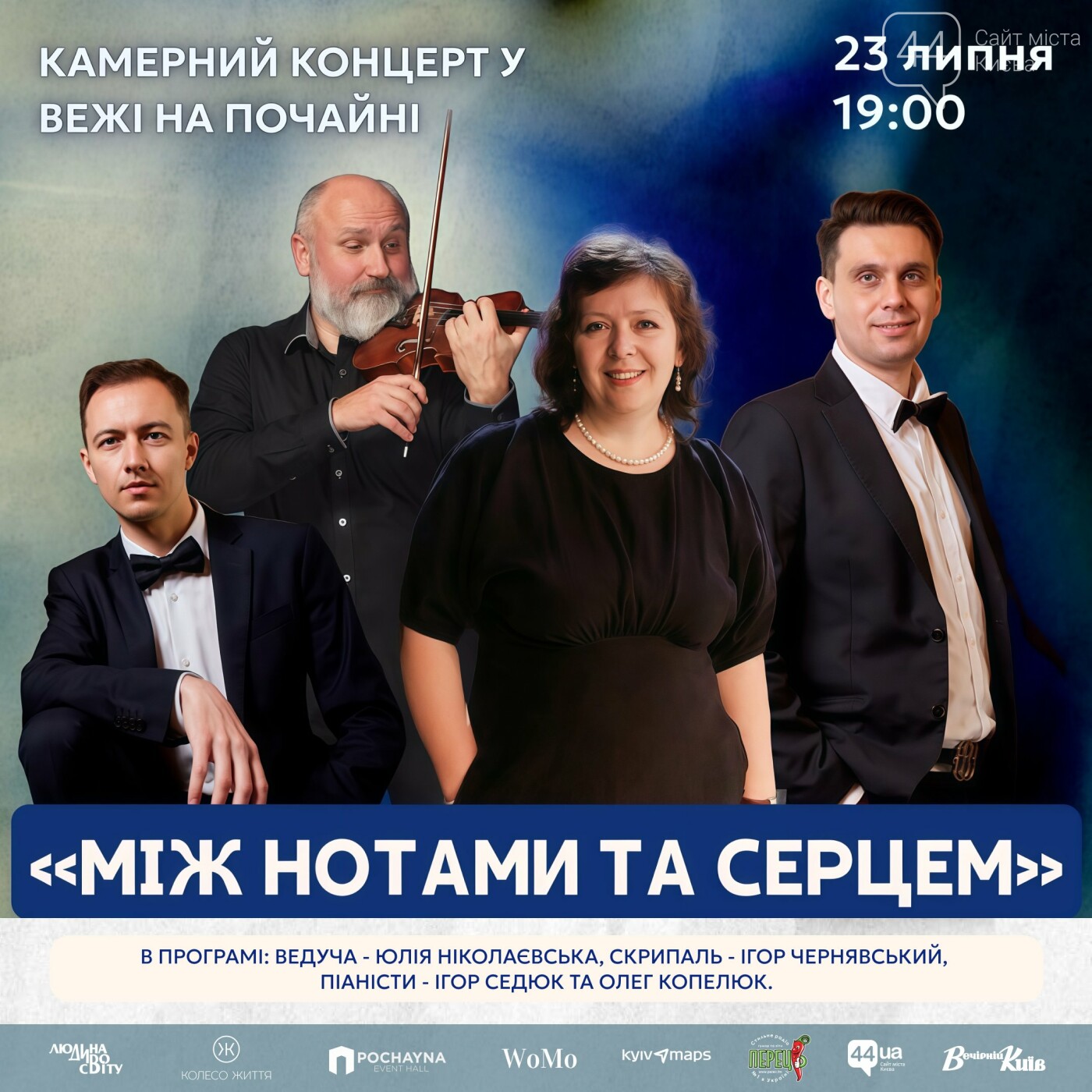 23 липня о 19.00 у «Вежі на Почайні» (в ТЦ GORODOK Gallery у Києві) під егідою неформальної дослідницької платформи Людина Диво Світ відбудеться камерний концерт «Між нотами та серцем» — подія, створена для тих, хто шукає глибину. Це буде вечір музики, яка не просто лунає, а промовляє. Творить простір присутності, в якому кожна тиша — змістовна, кожне звучання — щира розмова. Є музика, яка звучить і зникає. А є та, що лишається — між нотами і серцем. Саме таким буде виступ видатних музикантів: скрипаля Ігоря Чернявського, піаністів Олега Копелюка та Ігоря Седюка, за участі мистецтвознавиці Юлії Ніколаєвської.