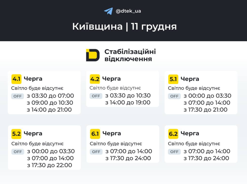 У четвер, 11 грудня, в Київській області діятимуть нові графіки відключення світла. Про це повідомляє ДТЕК.
